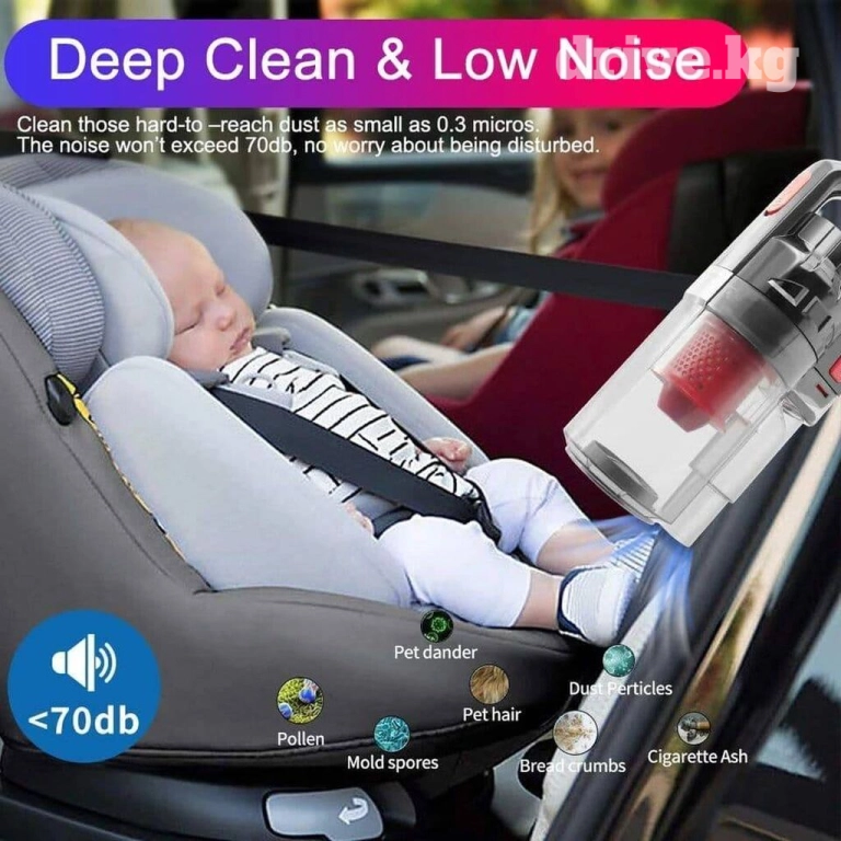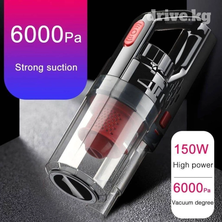 : автомобильный пылесос с мощным двигателем в 150 Вт обеспечивает сильное всасывание до 6000 Па, и с легкостью собирает все мелкие частицы, пищевой мусор,