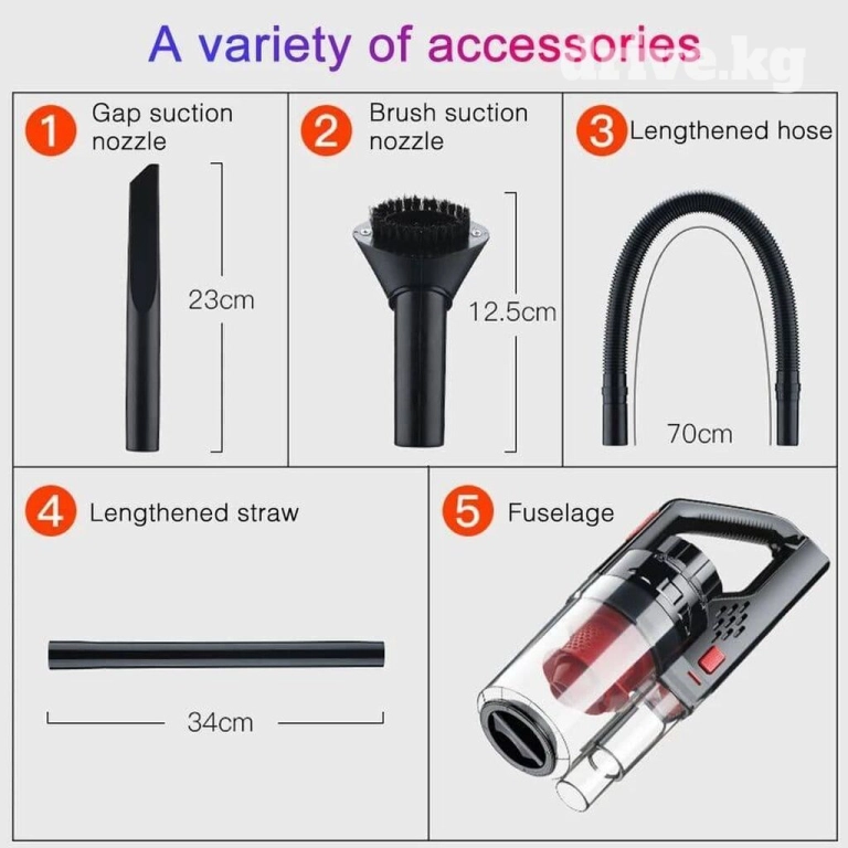 Комплектация: автомобильный пылесос, щетка для пыли, длинная плоская щелевая насадка, длинная круглая насадка, насадка-шланг, тканевый чехол для переноски