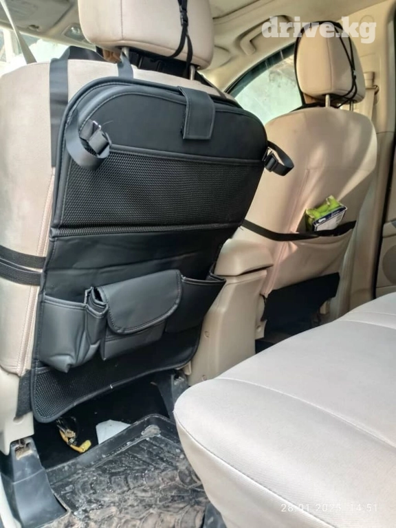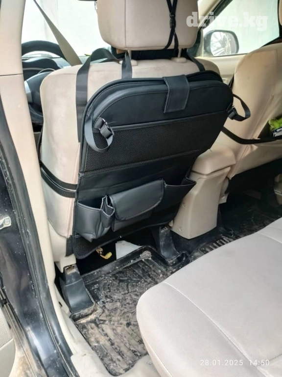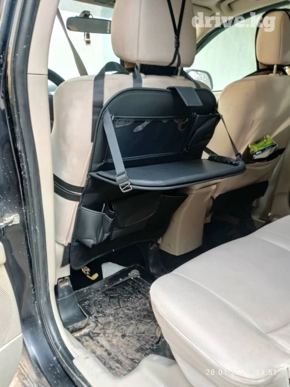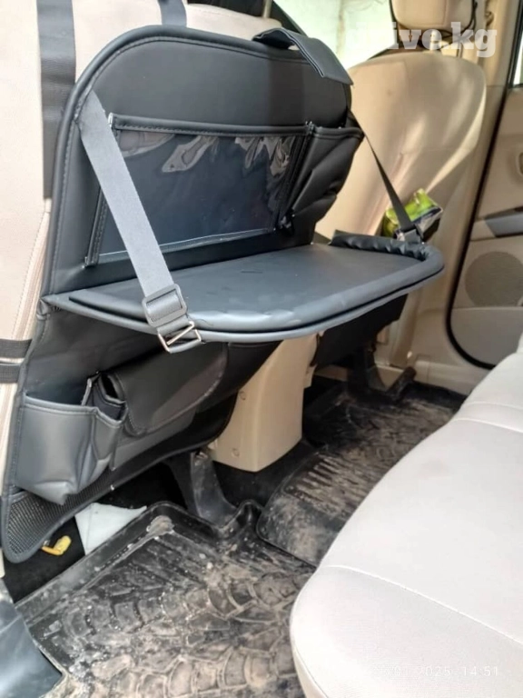 Автомобильный органайзер со складным столиком в черном цвете. Крепится к спинке переднего сиденья с помощью ремней. Оснащен несколькими карманами для хранения бутылок, гаджетов и других мелочей. Столик подходит для еды, работы с ноутбуком или планшетом. Идеален для дальних поездок и поддержания порядка в автомобиле.