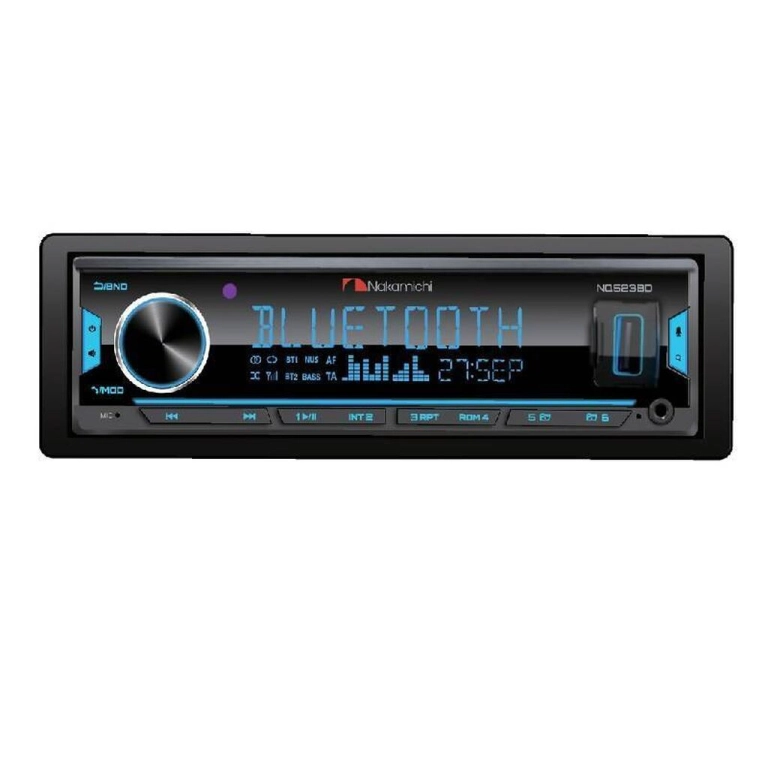 nakamichi nq523bd 1-диновый bluetooth, usb-ресивер со встроенным mosfet усилителем 4x50w. 2 пары линейных выходов rca (передний, задний), чтение форматов mp3 и wma, передний aux вход для подключения других источников звука. Встроенный am / fm-тюнер. Яркий хорошо читаемый дисплей, синяя подсветка кнопок. Устройство также позволяет заряжать смартфон или планшет через usb порт на лицевой панели. Он поставляется в прочном титановом корпусе.