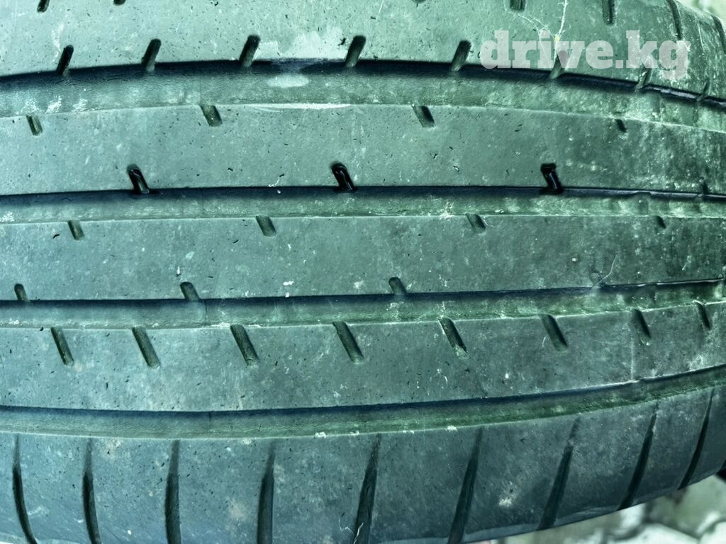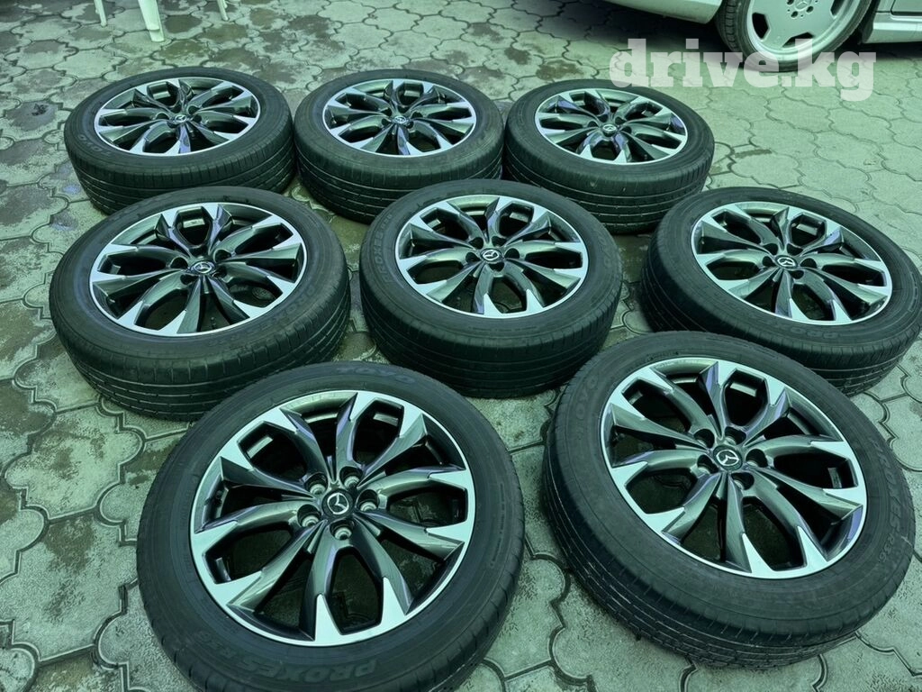 Комплект из восьми автомобильных колес в сборе. Диски литые, многоспицевые, с черными и серебристыми элементами. Шины японского производства с умеренным износом, подходят для комфортной езды по городу и трассе.