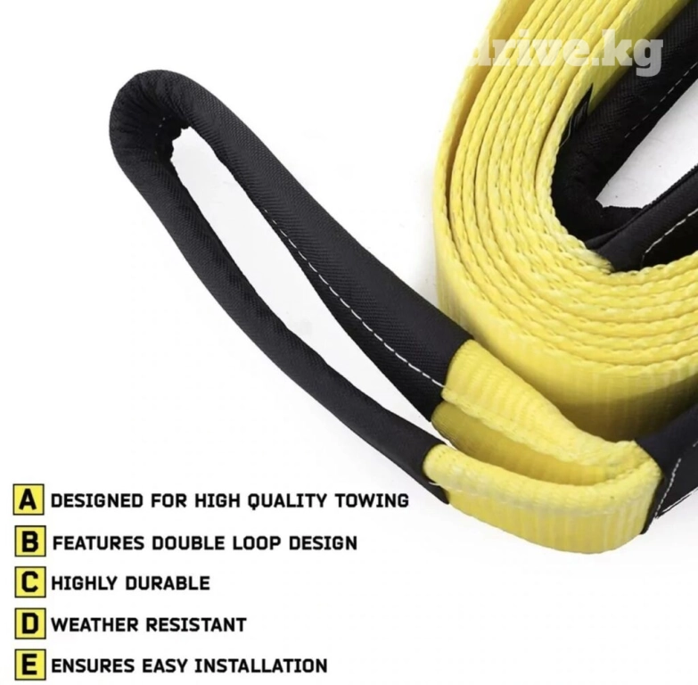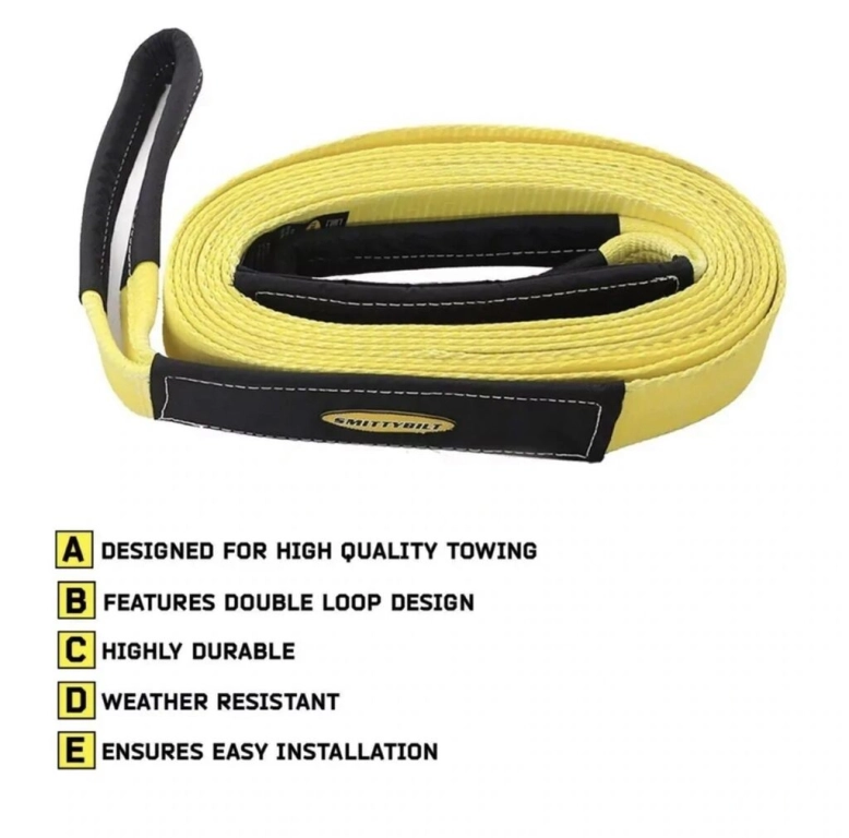 В динамических тросах Smittybilt длиной 2.45 м и шириной 10 см используются прочные двойные строчки с красивым дизайном с двойной петлей для надежного сцепления с буксиром .