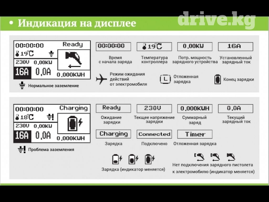 Встроенный экран отображает время зарядки, напряжение в сети, установленный ток зарядки, текущий ток зарядки, текущую потребляемую мощность, наличие заземления, статус зарядки и счетчик потребленной электроэнергии (Вт).