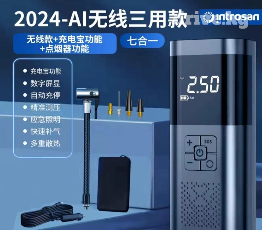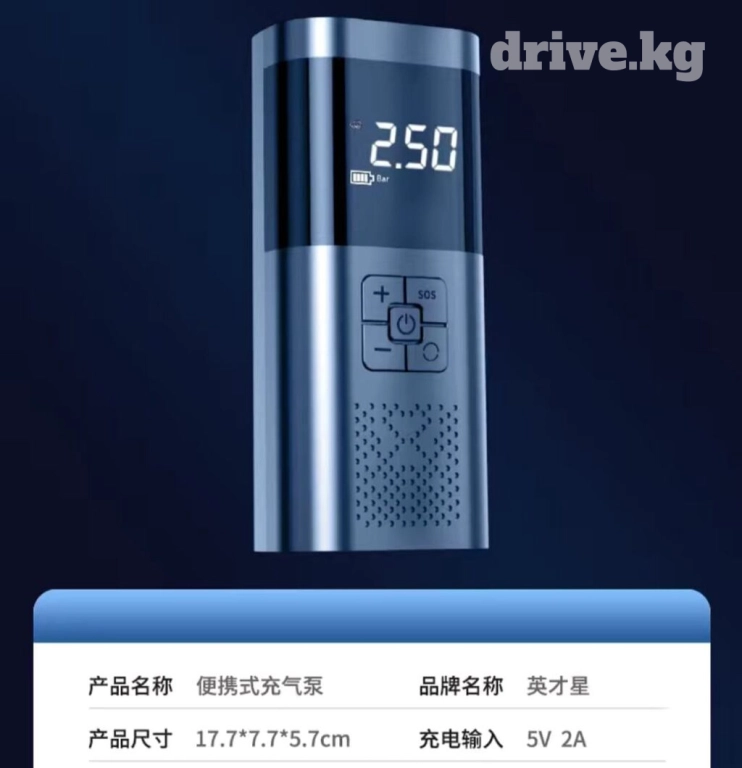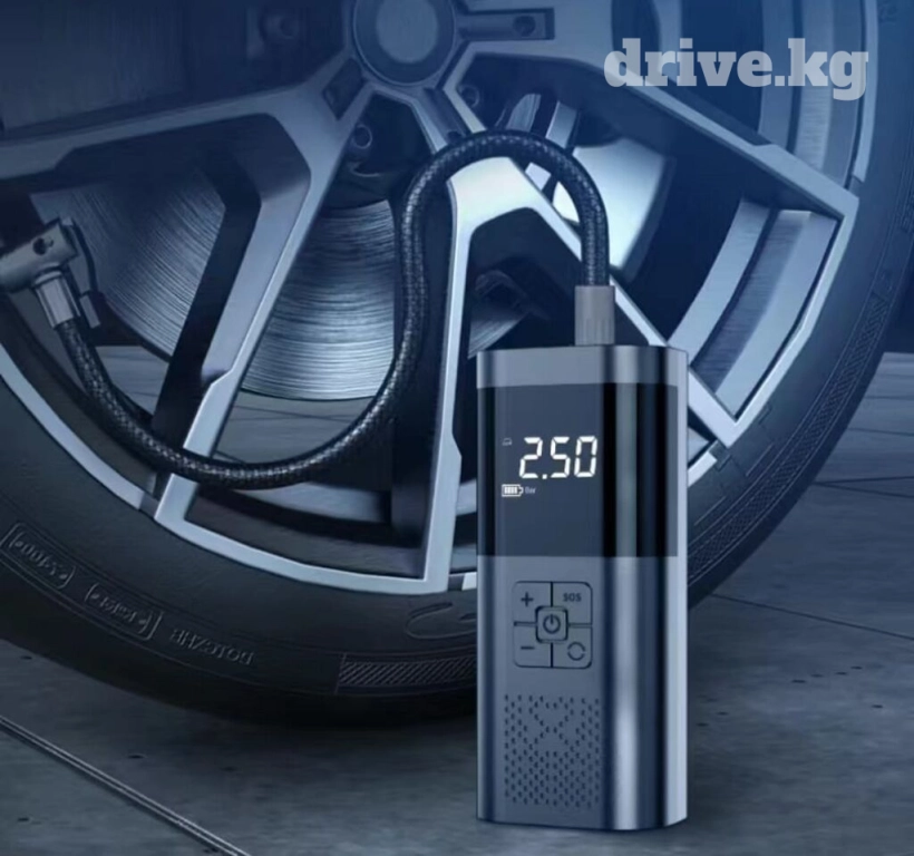компрессор как паэур банк.( без приводной ) заряжается от USB., свет, аварийка. 2,5 атмосферы.- две тысячи сом