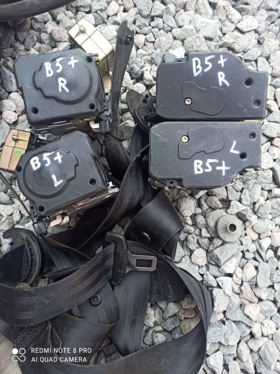 Пассат Б5 ремни безопасности Набор ремней безопасности для нас автомобиля, включающий четыре инерционные катушки и соответствующие лямки с пряжками. Две катушки маркированы "B5+ R" для правой стороны, и две "B5+ L" для левой стороны, что указывает на их совместимость с конкретной моделью автомобиля. Ремни безопасности черного цвета, оснащены стандартными механизмами крепления и замками. Комплект подходит для замены изношенных или поврежденных ремней безопасности, обеспечивая безопасность водителя и пассажиров.