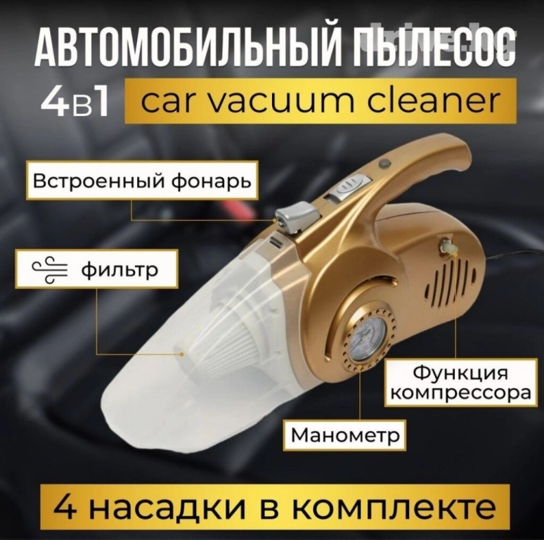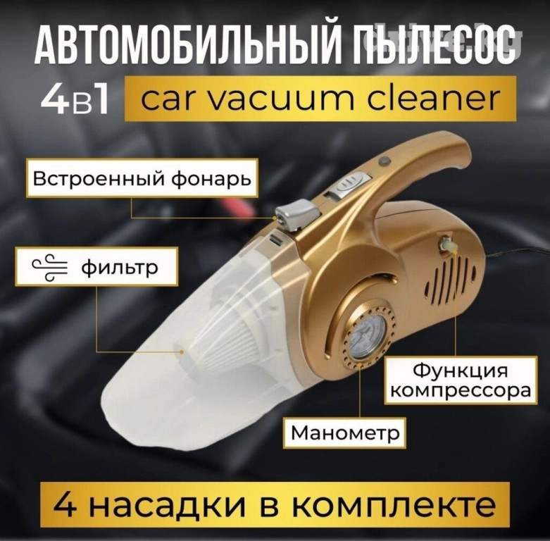 Автопылесос оснащен различными воздушными насадками для шин и чистки салона, позволяя вам достичь оптимального результата при уборке автомобиля. Комплект поставки включает в себя пылесос, 4 насадки, шланг для насоса и шнур-коннектор.