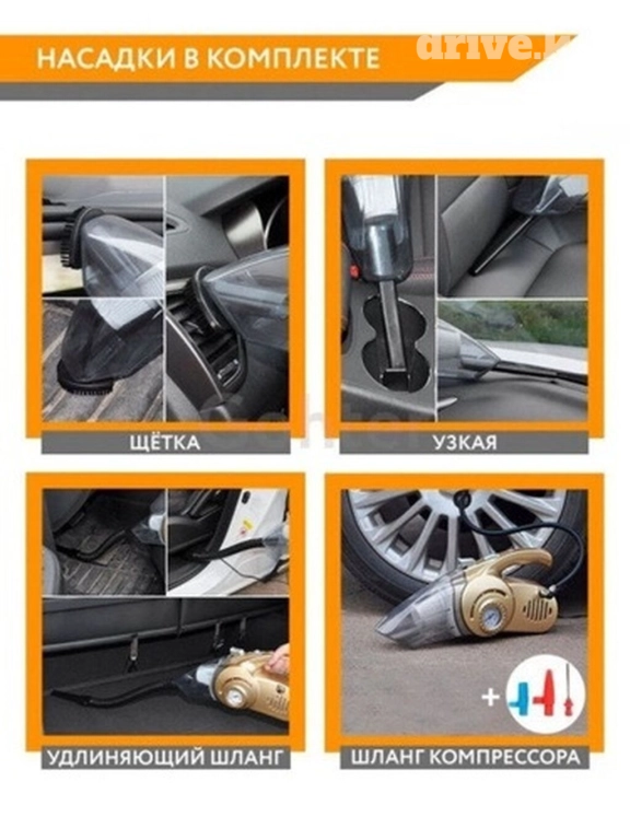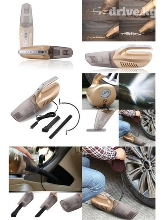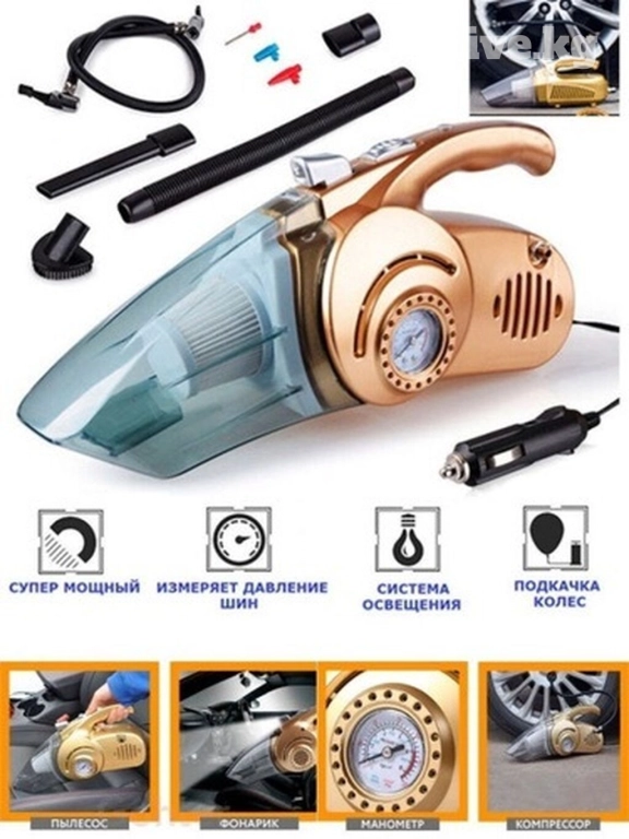 🔹 Функции: мощный автопылесос, фонарик, компрессор для подкачки колес и измеритель давления