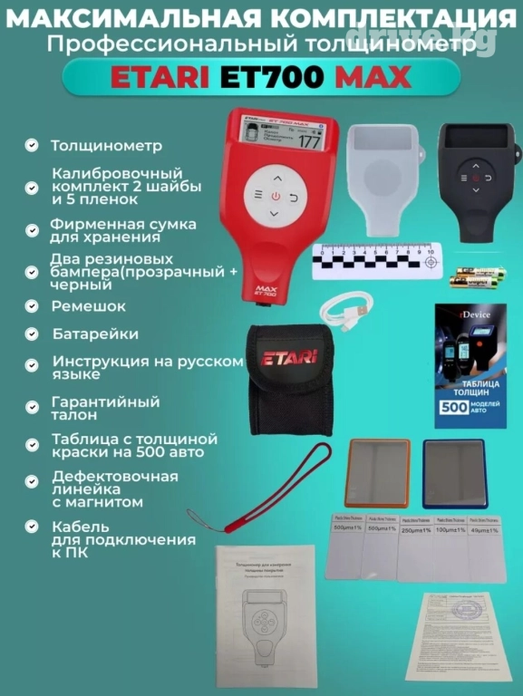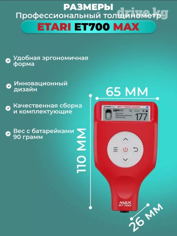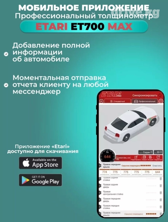 ЕТ 700 МАХ - это новый, современный и максимально технологичный прибор для измерения толщины лакокрасочного покрытия автомобиля.В разработку ЕТ 700 МАХ включили максимальное количество необходимых и важных функций, в том числе и совершенно новых.ЕТ 700 МАХ работает чётко, быстро и надёжно. Вся информация отлично видна на большом экране, а если данные измерений нужно сохранить или отправить, вы можете это сделать через простое и удобное мобильное приложение в формате 2D или 3D отчёта.Датчик повышенной износостойкости позволяет сделать до150млн измерений. Программное обеспечение данного прибора будет регулярно обновляться. Вы сможете делать это самостоятельно для добавления новых функций через специальный разъем и всегда иметь при себе самую новую и актуальную версию устройства.ЕТ 700 МАХ - это максимум точной информации. Здесь и Сейчас. При покупке аксессуары в подарокСиликоновый чехолРемешок на рукуБатарейки AAAИспользование:: Цветные Металлы/ Черные Металлы/Оцинкованное покрытиеДиапазон измерений на черн. металлах:: от 0 до 3000МКМДиапазон измерений на цвет металлах:: от 0 до 3000МКМВремя отклика:: 0.3 секундыLED фонарь: НетУльтрафиолетовый фонарь: НетАвтоматическое отключение:: 1 минутаТемпературный режим:: от -25 до 50Уровень влажности:: не более 75%Русифицированный интерфейс: ДаВыгрузка отчетов 2D и 3D: ДаОбновление ПО: ДаМобильное приложение: ДаУсиленный датчик 150 млн замеров: ДаОбнаружение металлической шпатлевки: Да