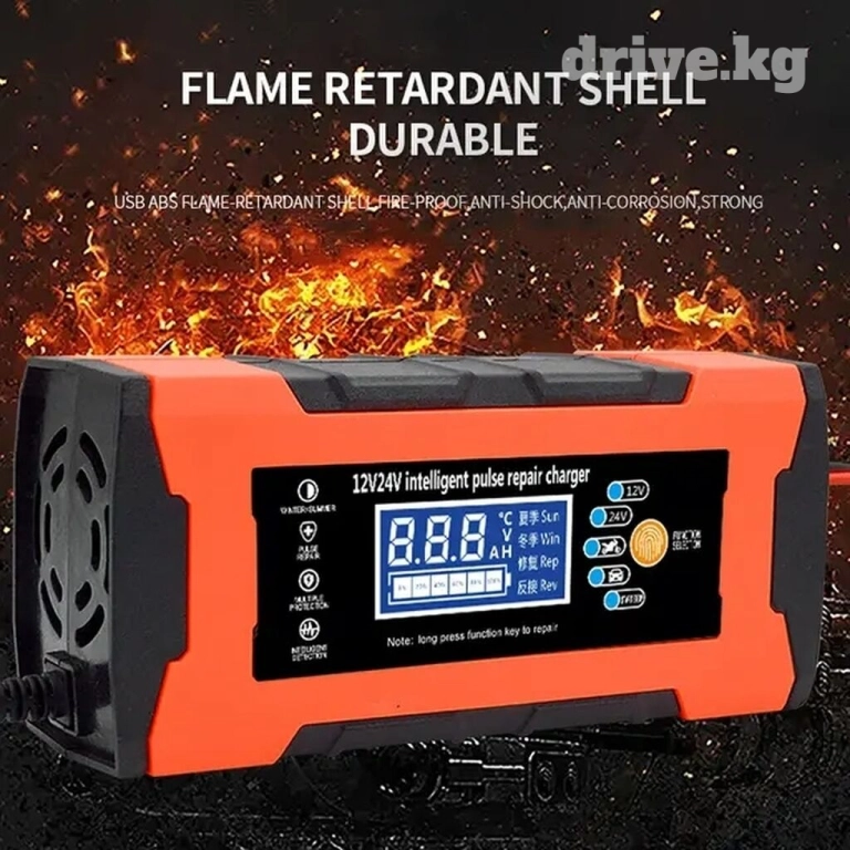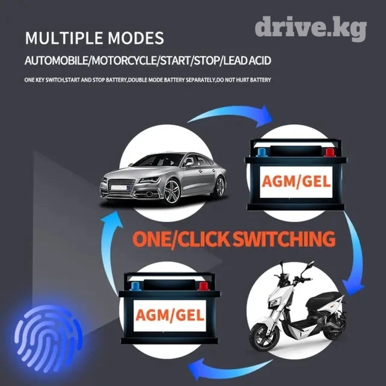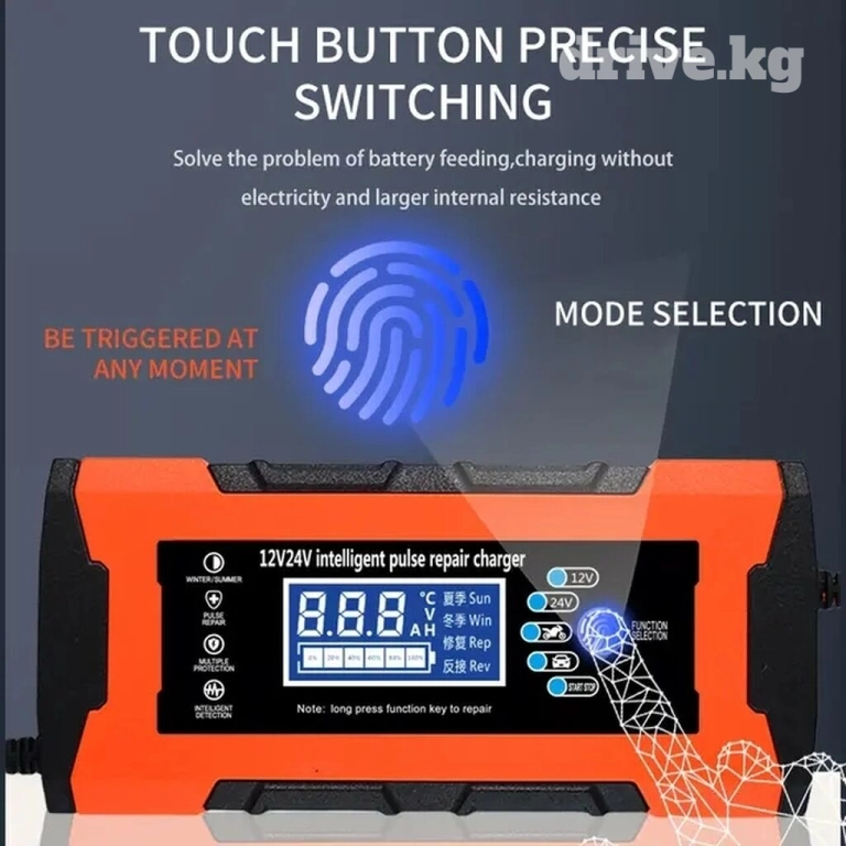 Степень заряженности отображается в %. Управление всего одной кнопкой - в виде отпечатка пальца. Можно выбрать режим зарядки 24в АКБ ( в случае ошибки зарядное само перейдет в необходимых вольтаж Вашего АКБ), гелевых АКБ, мотоАКБ или режим восстановления АКБ (repair).
