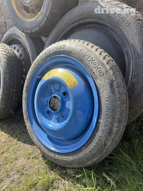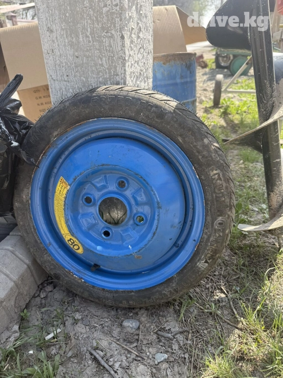 Запасное автомобильное колесо на синем стальном диске. Подходит для временной замены стандартного колеса в случае прокола или повреждения. Компактный размер позволяет удобно хранить в багажнике автомобиля. Указаны параметры давления для накачивания.