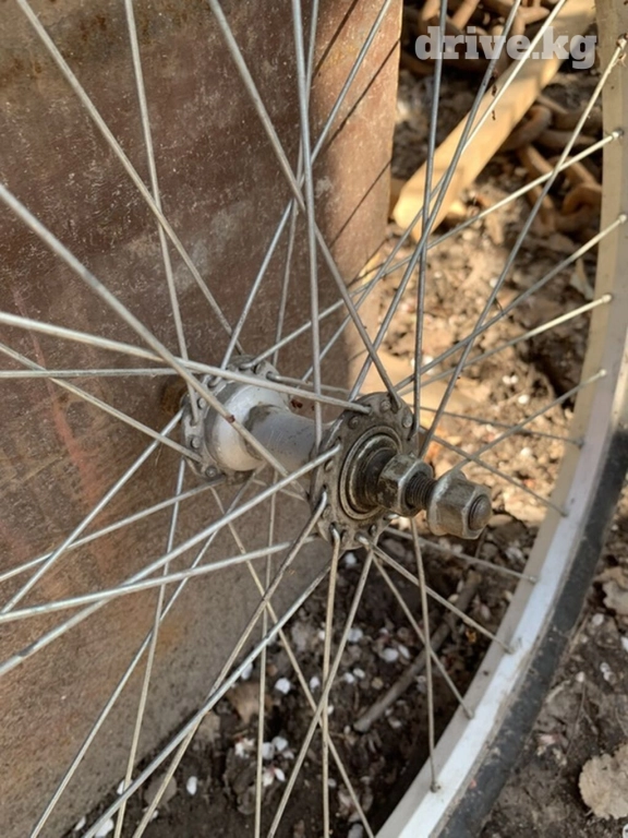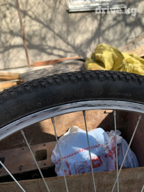 Пара велосипедных колес диаметром 26 дюймов. Обода серебристого цвета, спицы из металла. Покрышки с протектором, пригодные для езды по различным типам местности. Подойдут для замены изношенных колес или сборки нового велосипеда.