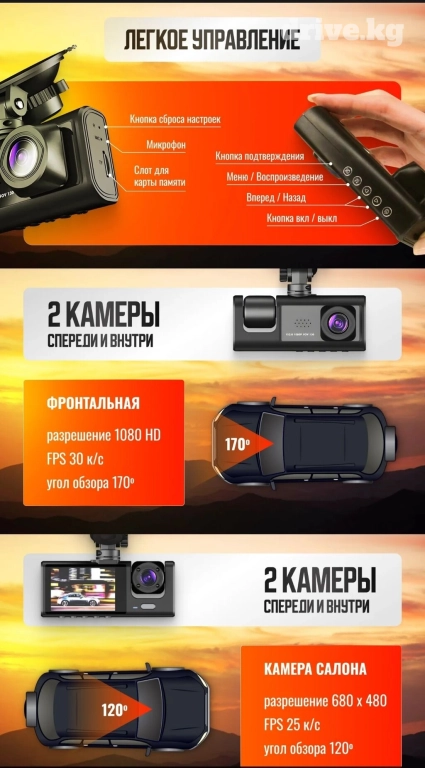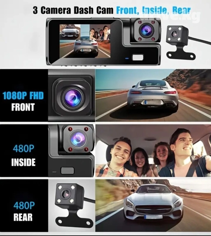 Автомобильный видеорегистратор 3 в 1 — залог безопасности и комфорта во время езды. Регистратор имеет фронтальную, внутреннюю салонную и заднюю камеры, которые позволяют осуществлять запись с различных углов и видеть все, что происходит вокруг вашей машины. Разрешение Full HD 1080 обеспечит съемку в отличном качестве, а HD экран на 2 дюйма и ЖК-дисплей помогут детально и четко рассмотреть участников движения, увидеть номера автомобиля и другие важные приметы. Угол обзора передней камеры составляет 155 градусов, а камеры заднего вида — 120 градусов, что позволит вам контролировать движение по нескольким полосам одновременно. Видеосъемка происходит со скоростью 30 кадров в секунду, что гарантирует плавное и качественное воспроизведение. Функция датчика удара помогает сохранить запись аварии или столкновения — при обнаружении удара авторегистратор сохраняет запись на карте памяти, чтобы вы могли использовать ее в качестве доказательства. Датчик движения запускает запись только во время поездки, что помогает сэкономить место на флешке, а также начинает съемку при обнаружении движения вокруг машины, чтобы защитить транспорт от вандализма или кражи. Можно включить режим парковки на 24 часа и оставить видеонаблюдение на долгое время — для этого необходимо прямое подключение автоаксессуара к аккумулятору. Парктроник поможет вам правильно и аккуратно припарковаться, а циклическая запись поможет автоматически освобождать место на карте памяти. Задняя камера оснащена 4-мя датчиками света для ночного видения, которые помогают осветить пространство в темноте, что обеспечивает качественную запись в любое время суток. В комплекте идет зарядное устройство, провод камеры заднего вида 6 метров, набор креплений, адаптер для карты памяти, инструкция на русском языке и гарантийный талон. Гаджет 3в1 станет отличным подарком мужчине и женщине — практичная автоэлектроника будет полезна каждому водителю!