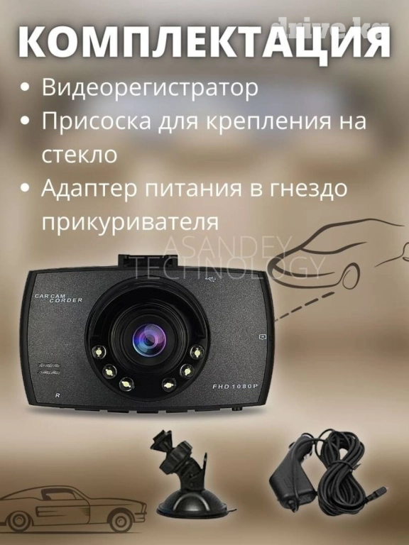 Комплектация Регистратор с камерой; Видеорегистратор автомобильный для автомобиля; Крепеж 1 шт; Зарядка 1 шт; видеорегистратор 1.шт.