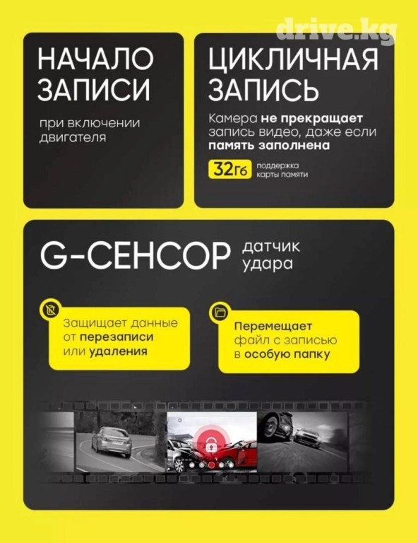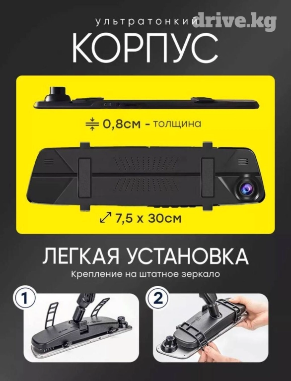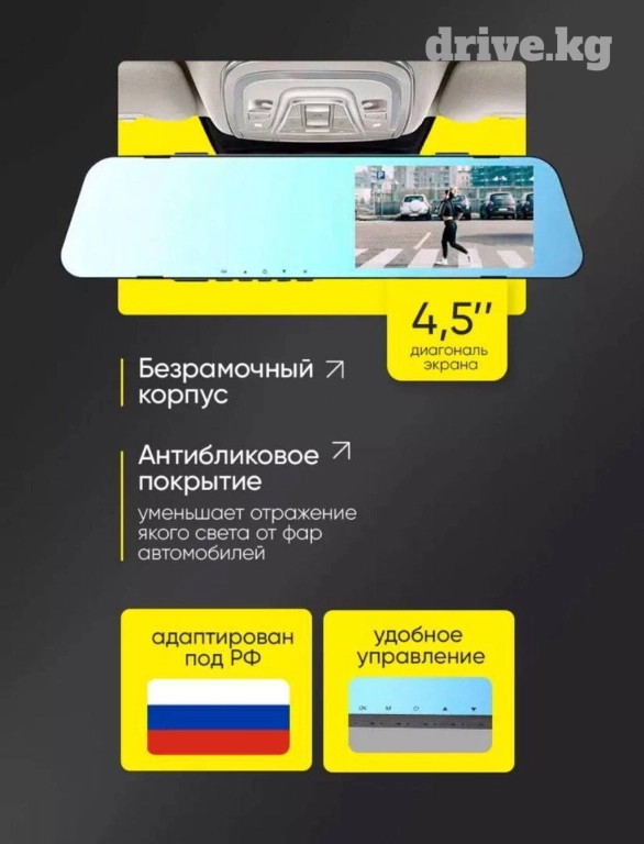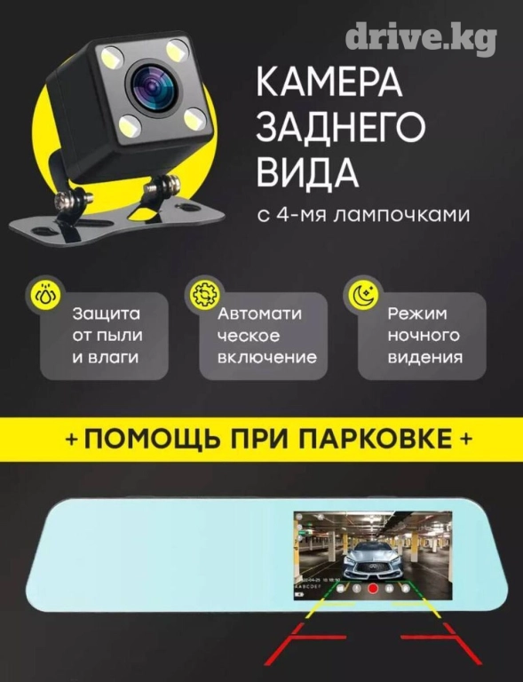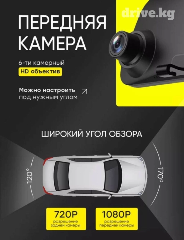 Задняя камера имеет угол обзора 120 градусов, и также позволяет оценивать ситуацию на Вашем пути. FullHD качество экрана и 2 камеры позволяют четко видеть обстановку и спереди, и сзади автомобиля. Даже при отключенном мониторе регистратор в машину используется как полноценное зеркало заднего вида, видеосъемка с камеры при этом не прерывается, а само зеркало Вы можете использовать, чтобы видеть, что происходит в салоне.