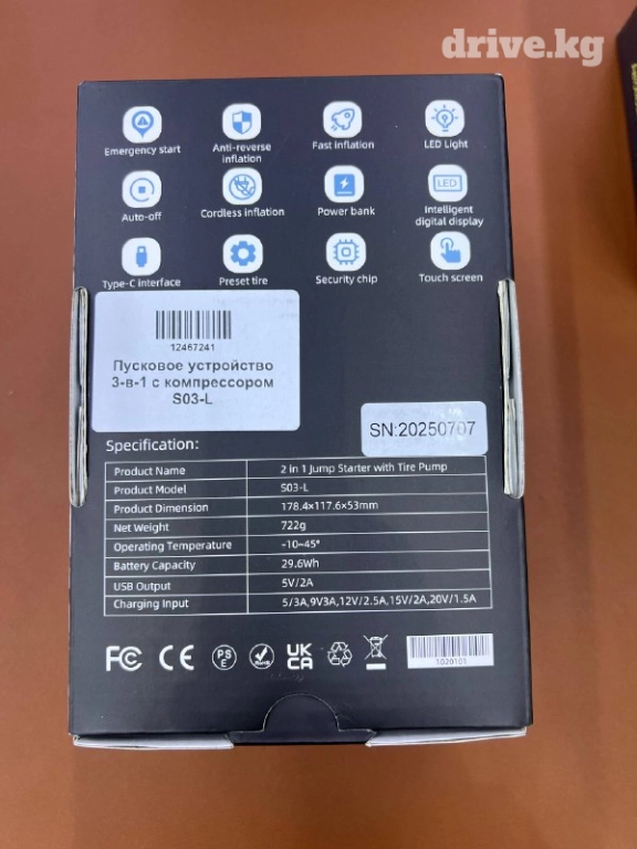 Мощное пусковое устройство 3-в-1 S03-L — незаменимый помощник для каждого автомобиля. Оно сочетает в себе джамп-стартер, компрессор для подкачки шин и портативный power bank, позволяя решить сразу несколько задач в дороге.