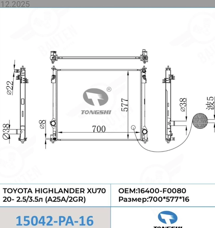 Радиатор охлаждения двигателя TONGSHI для Toyota Highlander XU70 (с 2020 г.), двигатели 2.53.5 л (A25A2GR).