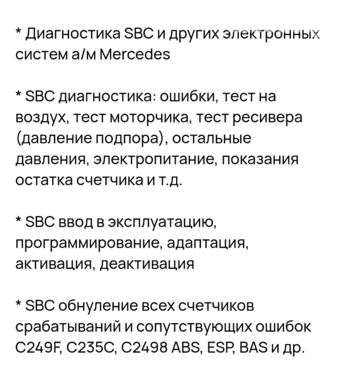 Профессиональная диагностика и ремонт тормозной системы сбц 211 абс 203, абр 221, 216. кузова.проверка и промывка форсунок прямого впрыска. внимание: на сообщения не отвечаю!! только звоните
