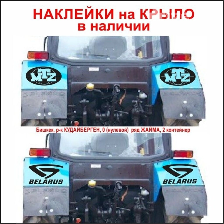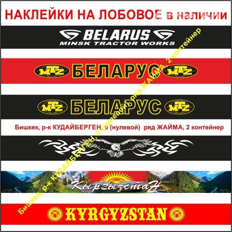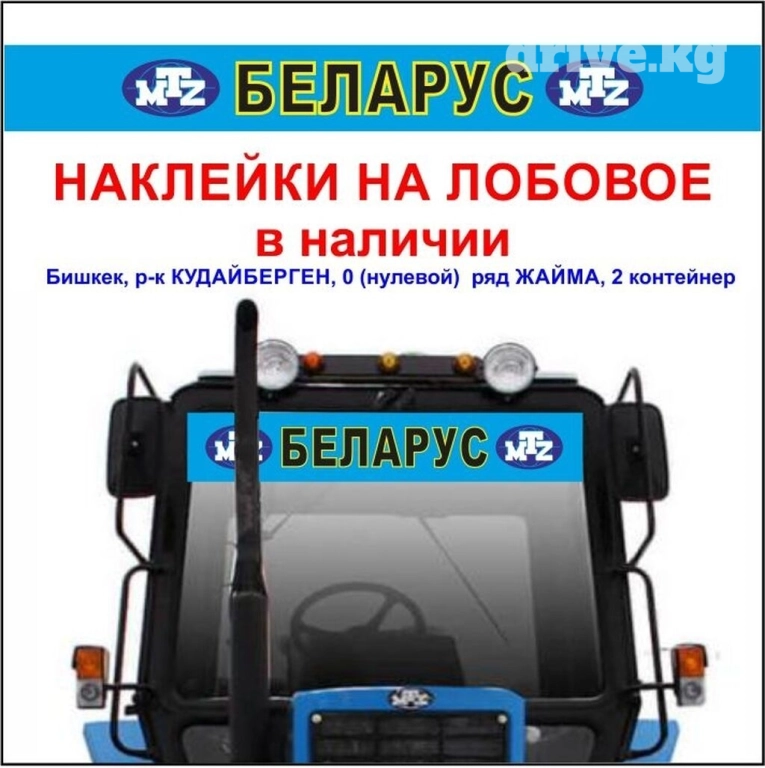 Наклейки на трактор МТЗ беларус 80, 82, 89, 820 , 892, 920, 952, 1021, 1025, 1221 в наличии на капот и лобовое стекло. А также в продаже вымпелы и шторы на беларус мтз . Адрес : бишкек, рынок кудайберген, 0 ряд жайма, 2 контейнер, заезд по ул. Волкова , работаем с 10 до 16 ч, выходной воскресенье. Звонить или писать можно с 10 до 18 ч.