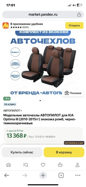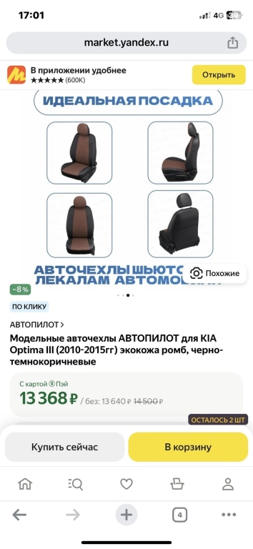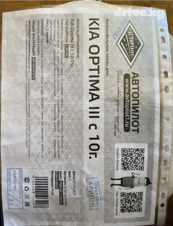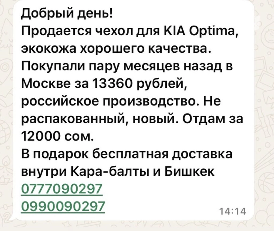 Продается чехол для KIA Optima, экокожа хорошего качества. Покупали пару месяцев назад в Москве за 13360 рублей, российское производство. Не распакованный, новый. Отдам за 11000 сом.